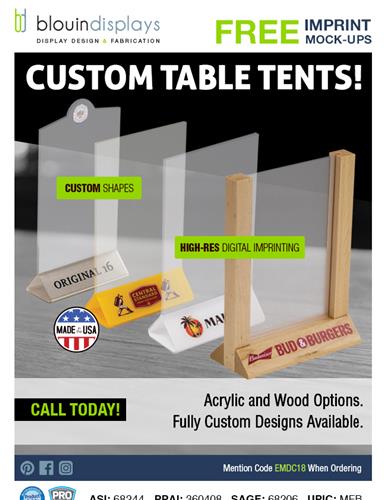 | | A modern look and premium feel? Meet the Romilda pens. from Spector & Co. | | | | Wood & Acrylic Imprinted Table Tents from Blouin Displays Line | |
