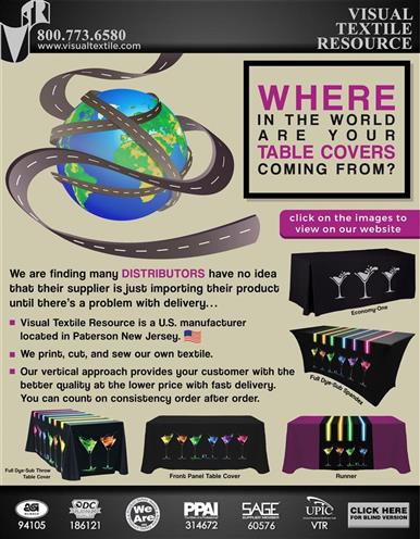 | | Where in the world are your table covers coming from? from VISUAL TEXTILE RESOURCE Line | | | | Resolve for a healthy new year with these promo products! from Pro Towels | |