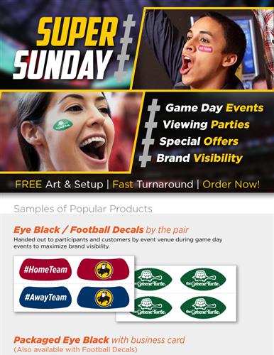 | | Top 4 Reasons to Choose Wholesale Banners Online from wholesalebannersonline.com | | | | Custom Eye Black - The Perfect Super Sunday Promotion from Eyeblack | |